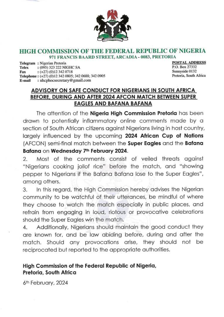 Ahead of the semi final clash against South Africa on Wednesday, the Nigerian Embassy in South Africa has released a communique to all Nigerians in South Africa to be cautious.