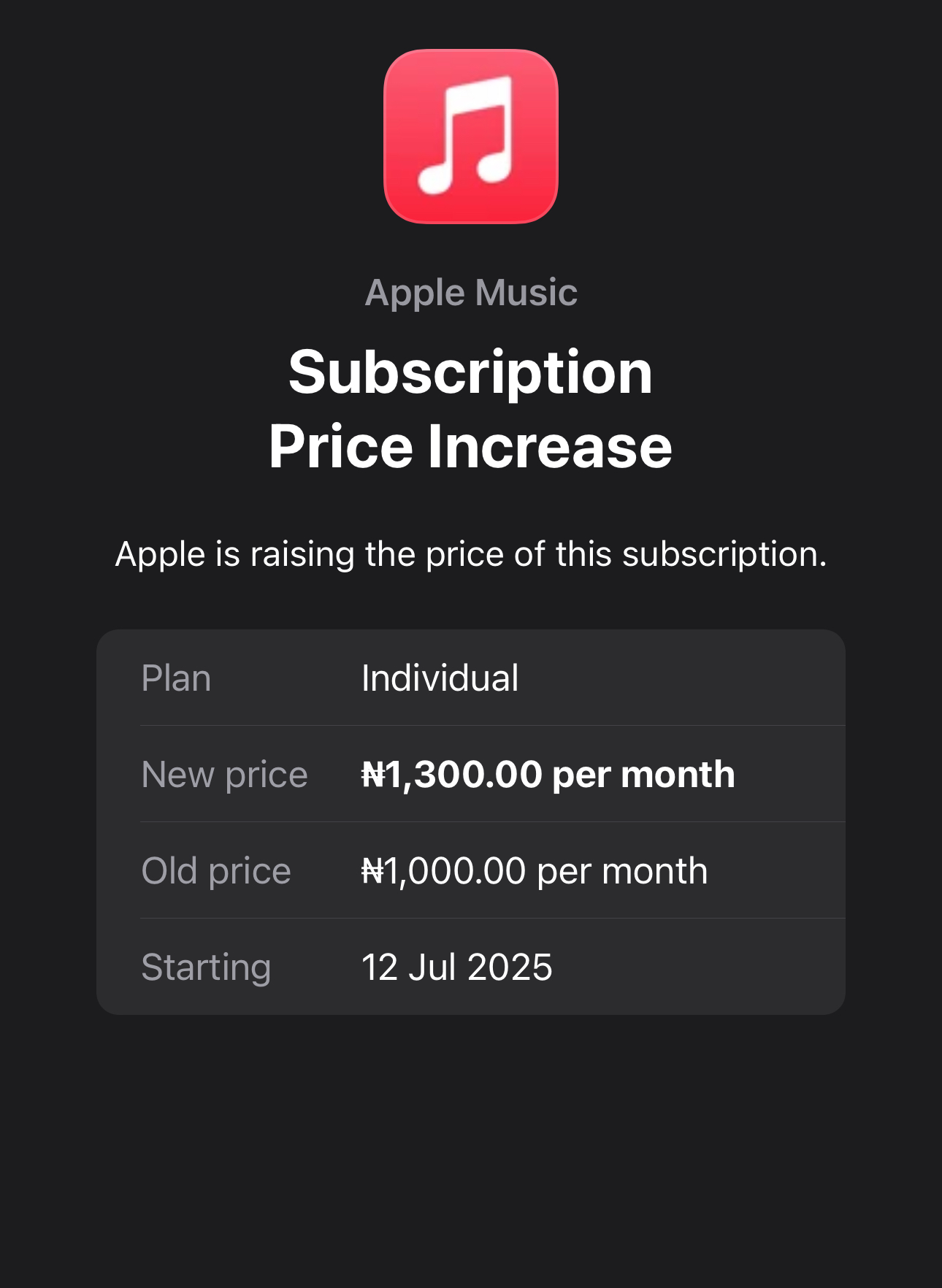 Apple has announced a significant increase in its Apple Music subscription prices in Nigeria, set to take effect from 12 July 2025. The tech giant revealed plans to raise the individual plan from ₦1,000 to ₦1,300 per month, marking a 30% hike, as confirmed through emails sent to subscribers earlier this month.