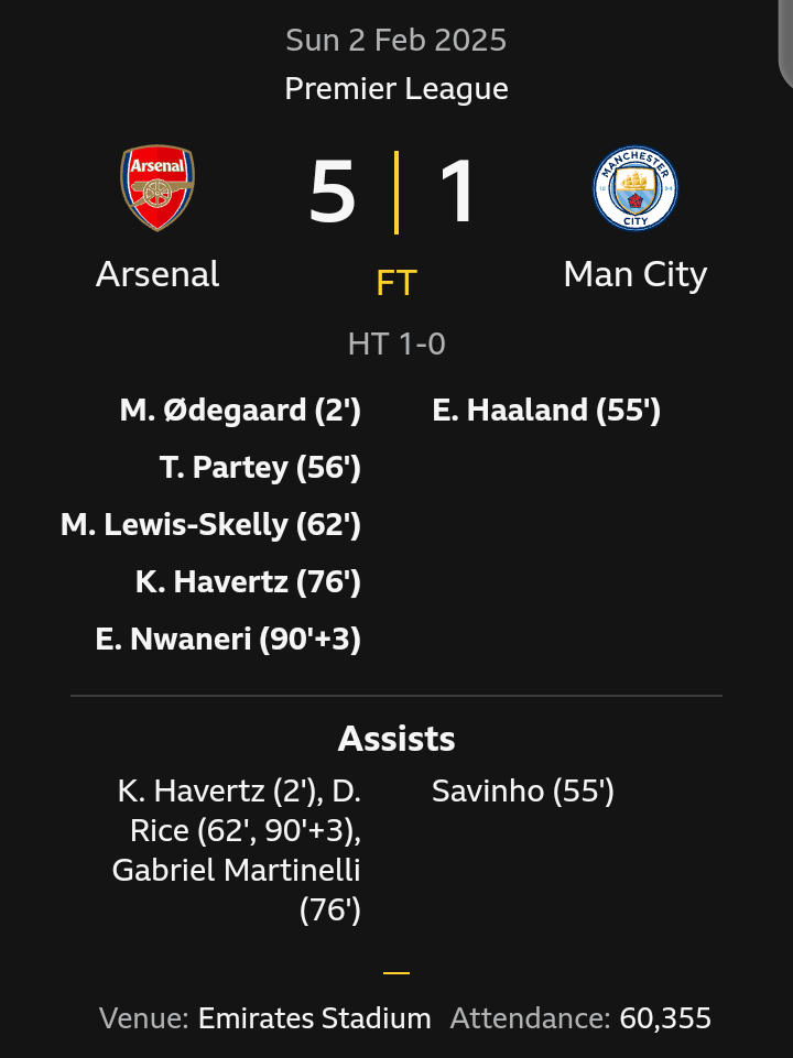 Arsenal Thrashes Manchester City 5-1 In Emphatic Premier League Statement.