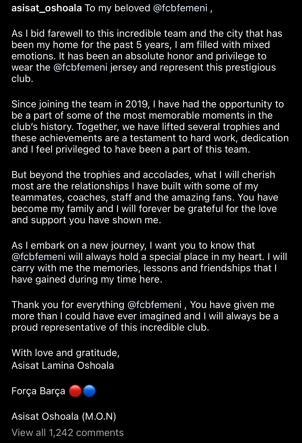 Oshoala dropped her farewell speech to Barcelona via her X(formally Twitter) account as seen in the picture below.