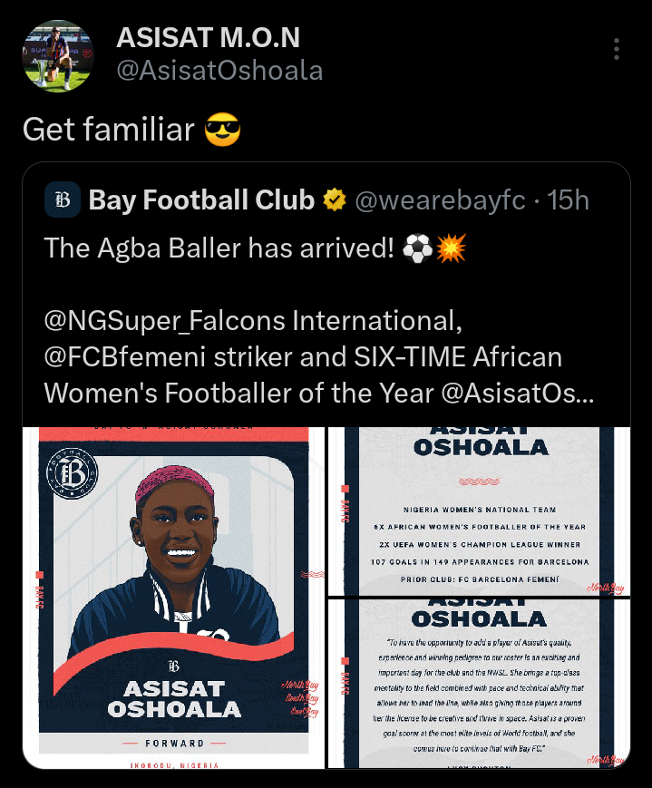 “Asisat is a proven goalscorer at the most elite levels of world football,” Bay FC general manager Lucy Rushton said.