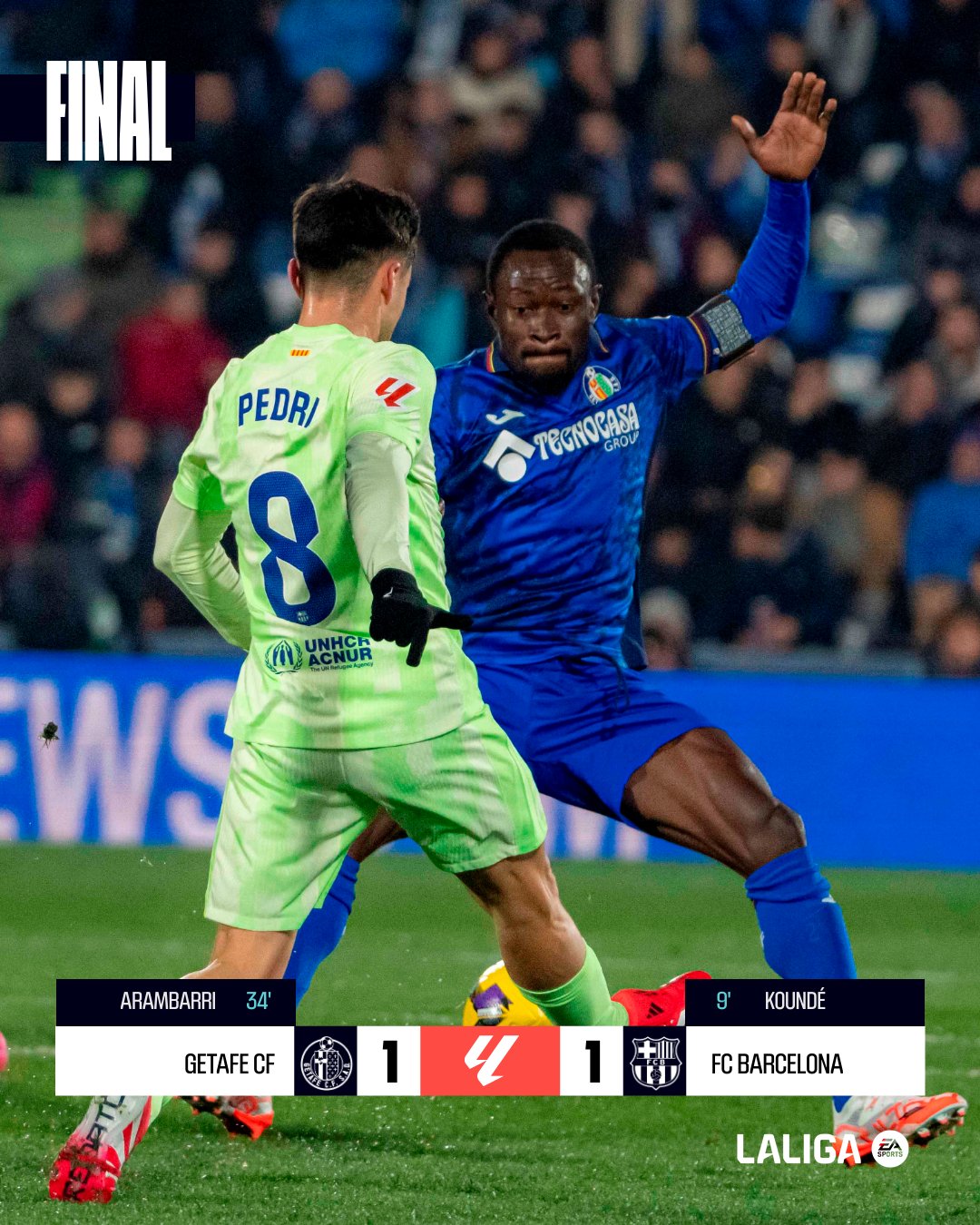 In the second half, Barcelona pushed for a winner, with Frenkie de Jong coming closest. His powerful shot from distance was brilliantly tipped over by the ever-alert Soria, preserving the draw for the home side.