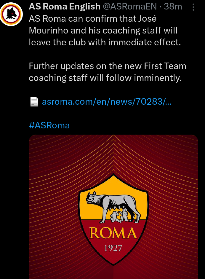 Serie A side AS Roma have announced that they have parted ways with manager Jose Mourinho.