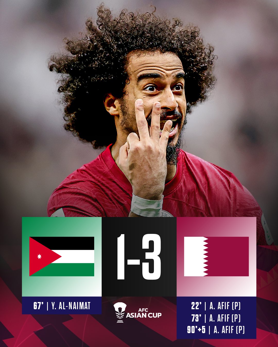 Qatar won a third penalty in added time when Afif was through on goal and brought down by goalkeeper Yazid Abu Layla, with the forward stepping up to put the game out of reach for Jordan, to seal Qatar’s victory.