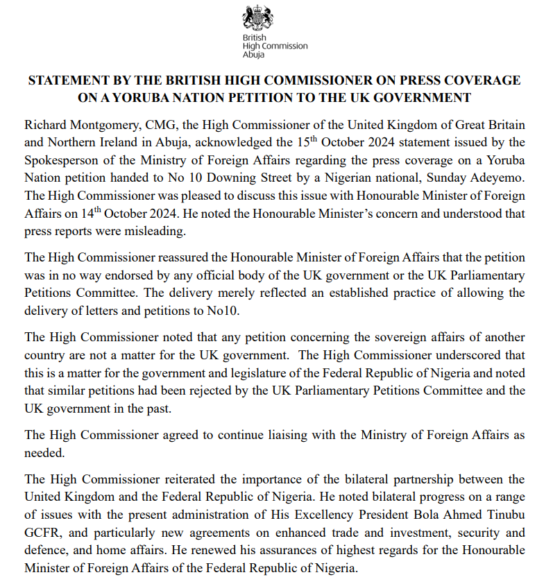 British High Commissioner Responds To Press Coverage On Yoruba Nation Petition.