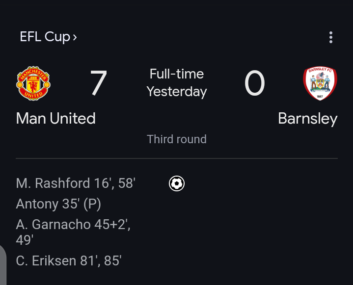Manchester United enjoyed a triumphant night as they secured their biggest victory under manager Erik ten Hag, cruising into the EFL Cup last-16 with a commanding win over League One side Barnsley. The 7-0 rout saw goals from Marcus Rashford, Alejandro Garnacho, Christian Eriksen, and a penalty from Antony, in what became a night to remember at Old Trafford.
