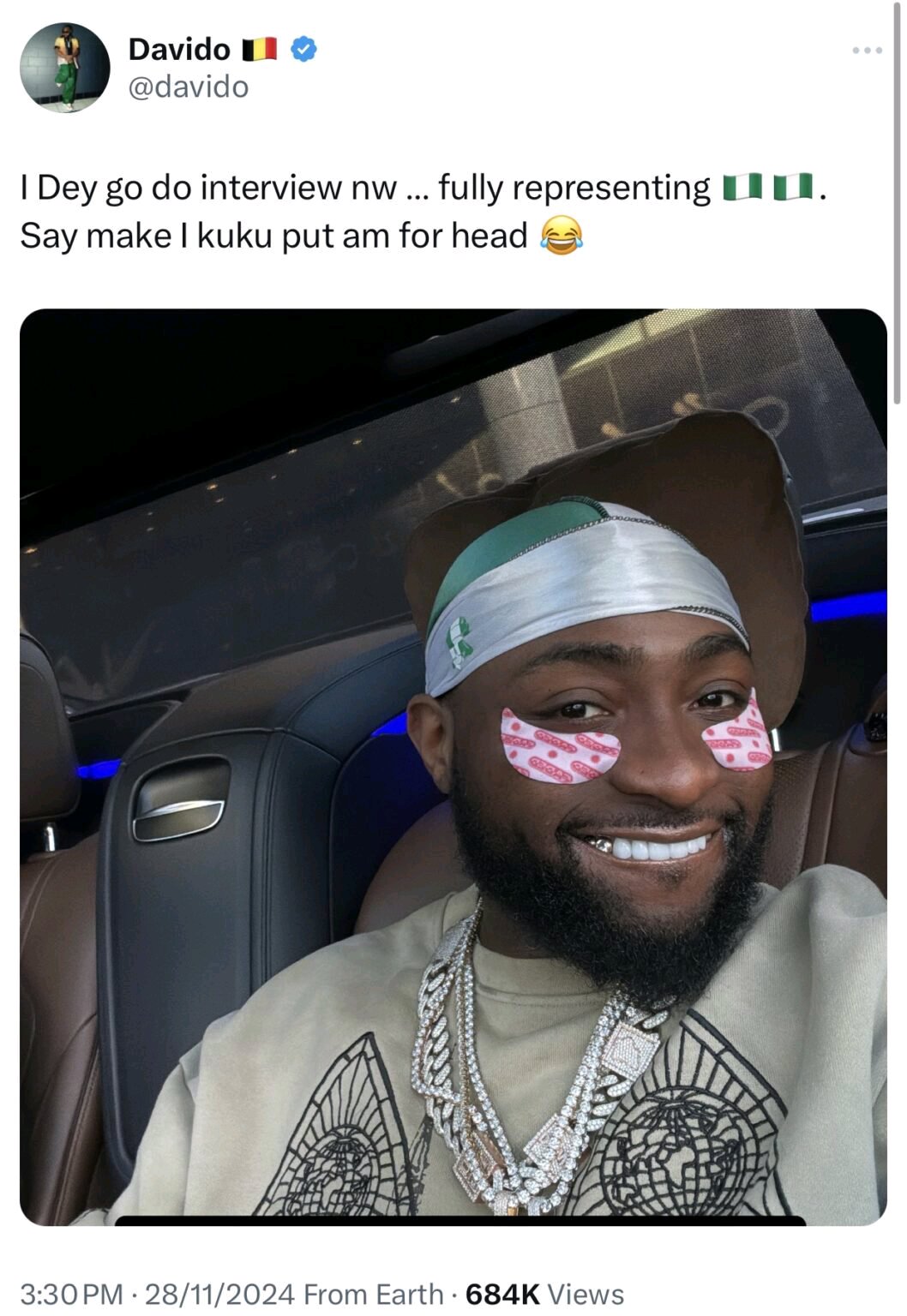 In a tweet accompanying the photo, Davido playfully addressed those who accused him of not fully embracing his Nigerian identity in previous statements. “I Dey go do interview nw … fully representing. Say make I kuku put am for head,” he wrote, proudly showcasing his Nigerian pride.
