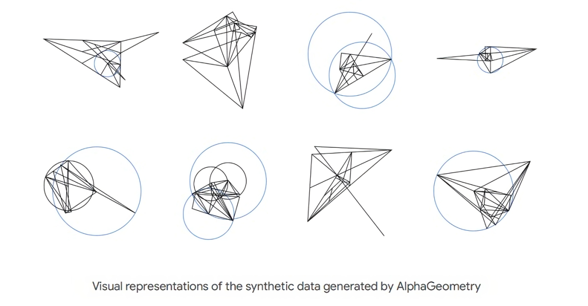 To overcome the lack of usable geometry training data, DeepMind created synthetic data, generating 100 million synthetic theorems and proofs of varying complexity. AlphaGeometry was then trained from scratch on this synthetic data and evaluated on Olympiad geometry problems.