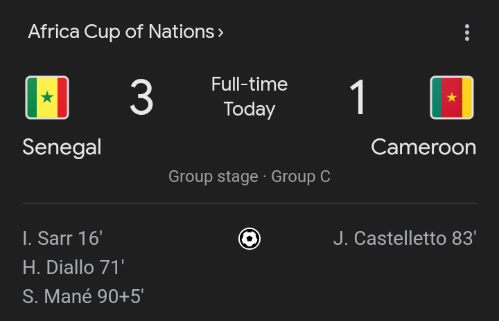 Senegal 3 Cameroon 1 it ended: as Sarr, Diallo and Mane all scored to secure qualifications for the knockout rounds as Cameroon lies in uncertainty.