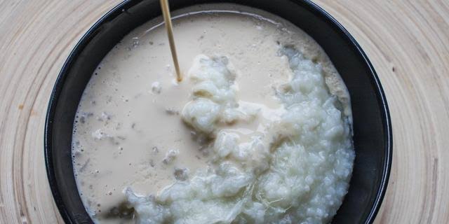 Boil for about 20 minutes till the rice has soaked the water and is soft. Add the salt and the other cup of water if needed. Using a ladle, beat the rice against the saucepan to form a smooth- pudding-like consistency.