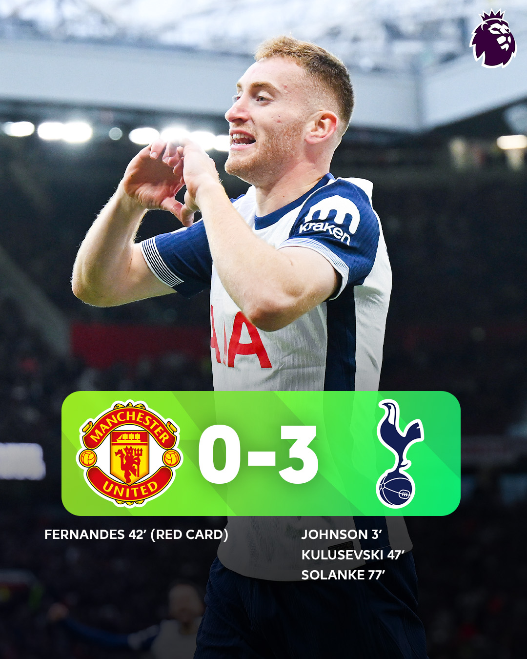 Tottenham doubled their lead shortly after the break, with Dejan Kulusevski flicking in a deflected cross from Johnson, further punishing United’s fragile defence. Despite a brief rally from United’s depleted side midway through the second half, they could not capitalise on their opportunities. Instead, Spurs sealed the win when Dominic Solanke turned in from close range following a well-executed corner involving substitutes Lucas Bergvall and Pape Sarr.