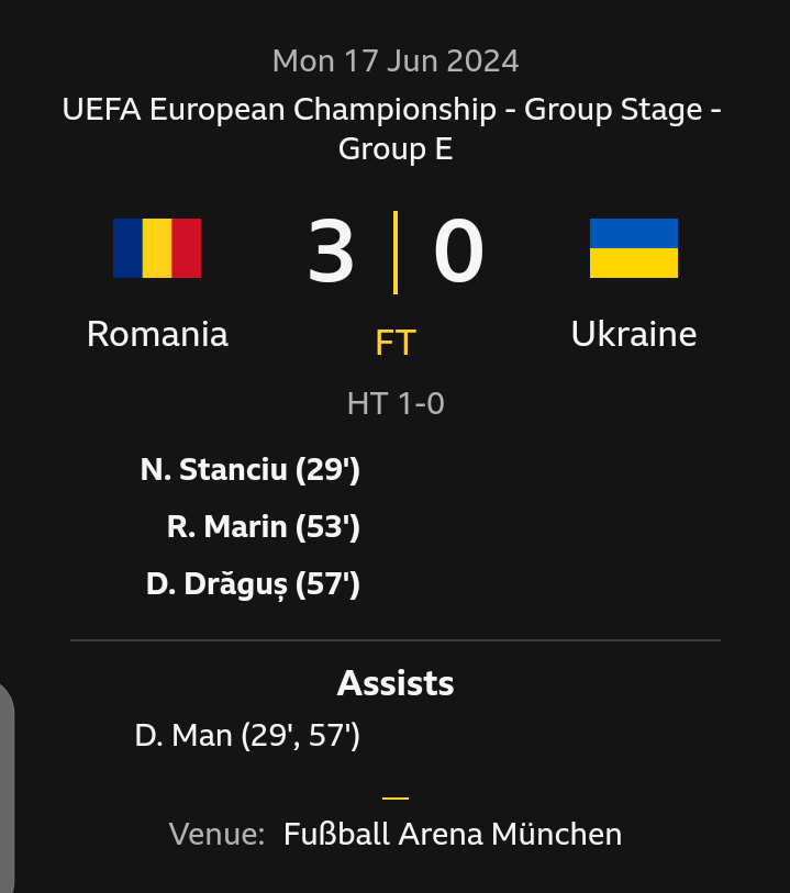 Despite being 24 places below their opponents in the world rankings, Romania, cheered on by a wall of yellow in Munich, capitalised on a poor clearance by Lunin, which was intercepted by Man, who set up Stanciu for a wonderful first-time shot into the net.
