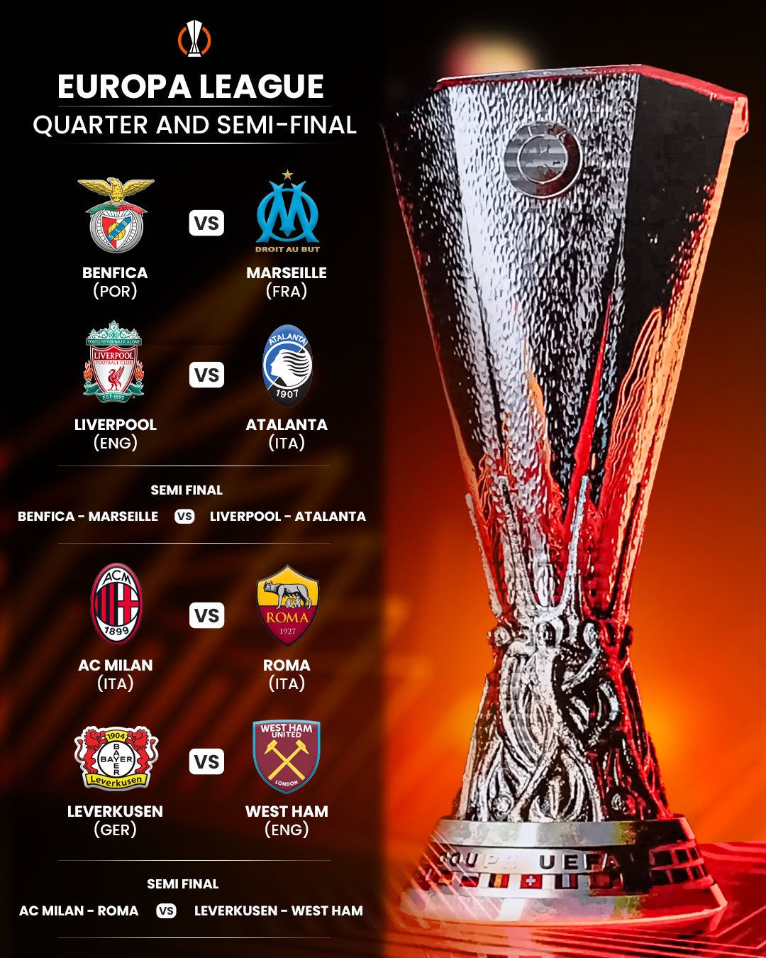 In another intriguing matchup, Italian rivals AC Milan and Roma will clash for a spot in the semi-finals, while Portuguese giants Benfica take on Ligue 1 side Marseille.