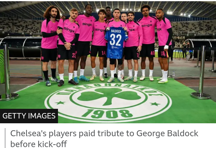 Before kick-off, Panathinaikos players warmed up in shirts bearing Baldock’s number, 32, while Chelsea players held up a shirt with his name and number. Both sets of fans joined in with placards displaying the number 32, as David Bowie’s “Starman” echoed through the stadium in tribute to Baldock’s nickname.