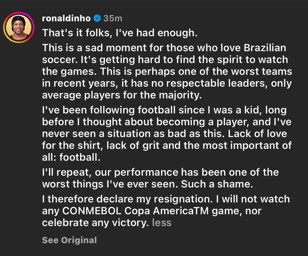Ronaldinho continued, “I’ve been following football since I was a child, long before I thought about becoming a player, and I’ve never seen a situation as bad as this. The shirt lacks love, determination and most important of all: football. Our performance has been one of the worst things I have ever seen. A shame. Therefore, I declare here my abandonment. I will not watch any Copa America game, nor celebrate any victory.”