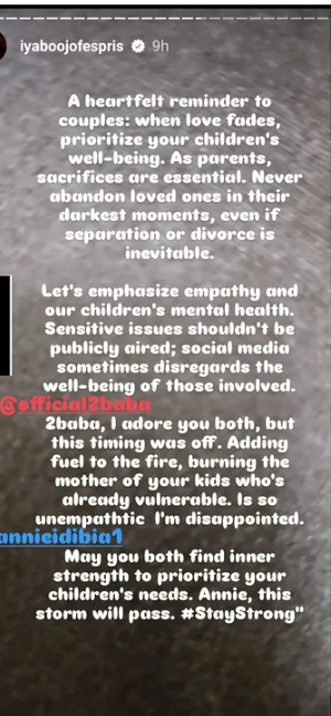 Ojo also expressed disappointment in 2Baba’s handling of the situation, stating that his announcement was poorly timed and added fuel to the fire, causing more harm to Annie, who is already vulnerable.