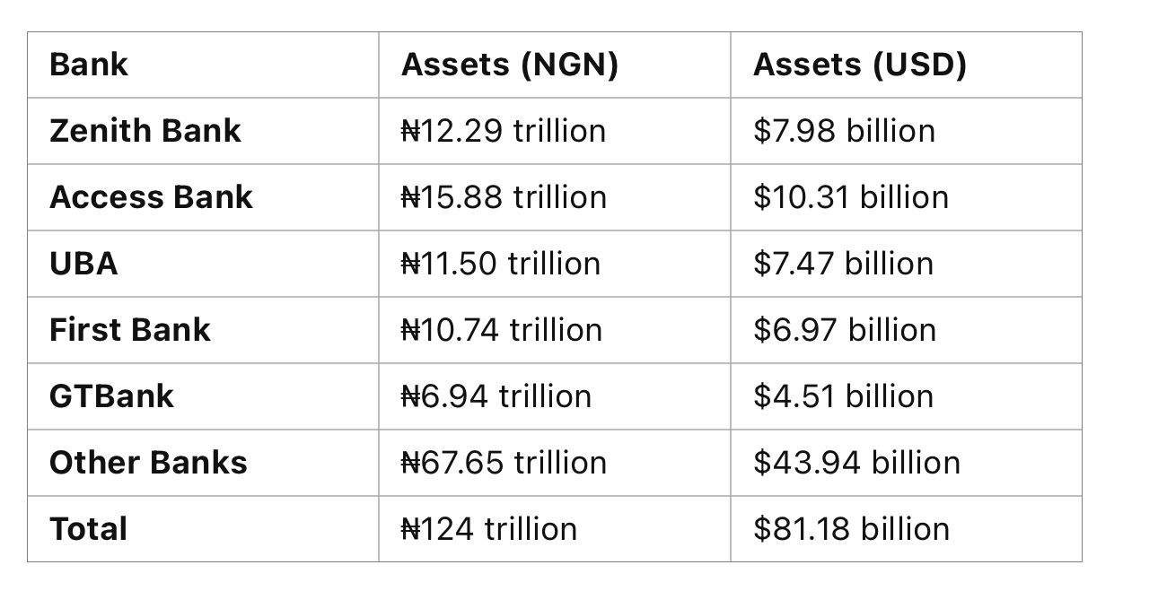 • The total assets of Nigerian banks as of December 2023 stand at ₦124 trillion, which converts to $81.18 billion based on the current exchange rate of ₦1,539.65 per USD.
