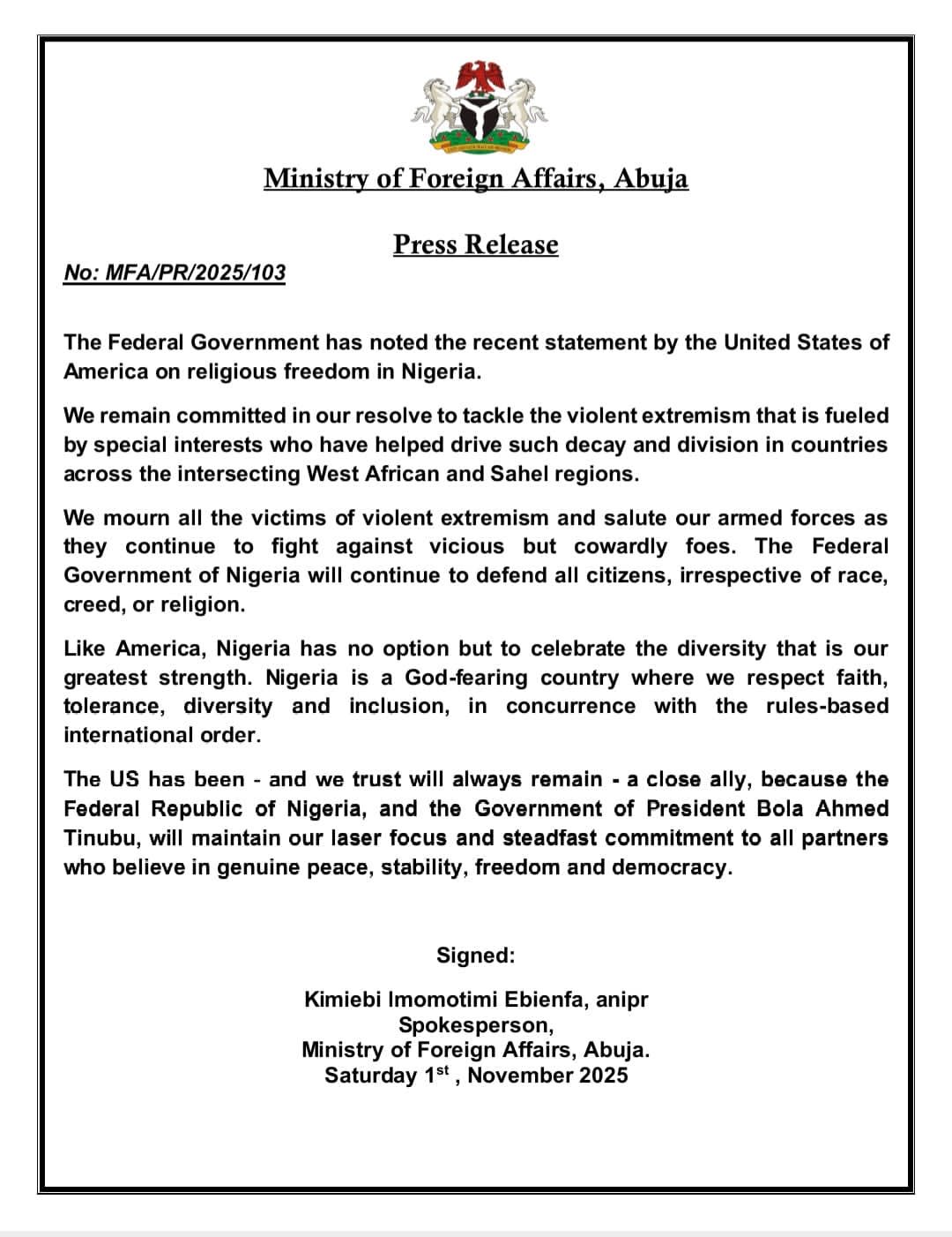 Nigeria further maintained that its security agencies are actively addressing all forms of violent extremism and terrorism, which affect citizens regardless of religious affiliation. The statement stressed that the government has intensified measures to protect lives and property, while also working with local and international partners to end insecurity.