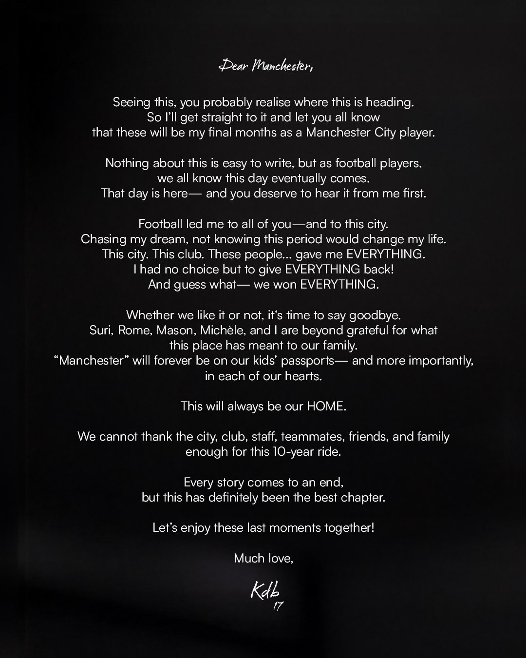 In his heartfelt message to fans, De Bruyne wrote, “Dear Manchester… These will be my final months as a Manchester City player. This city. This club. These people … gave me EVERYTHING. I had no choice but to give EVERYTHING back! And guess what – we won EVERYTHING. Whether we like it or not, it’s time to say goodbye … Every story comes to an end but this has definitely been the best chapter.” He added that Manchester will “forever be on our kids’ passports – and more importantly, in each of our hearts,” reflecting the deep bond his family has formed with the city.