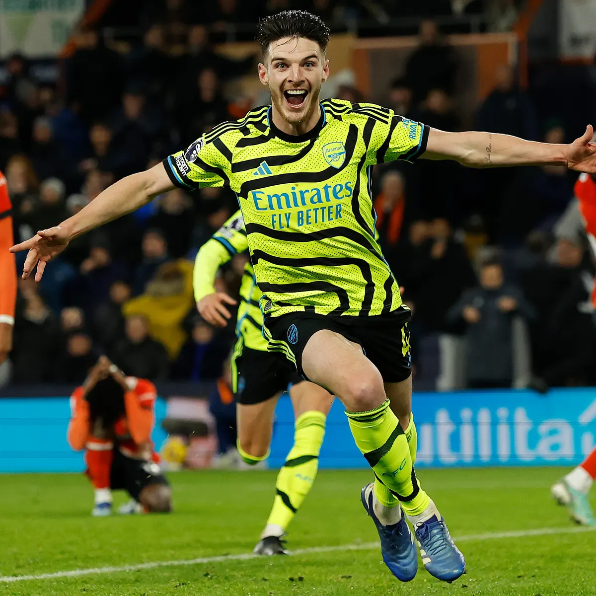 Declan Rice’s last-gasp header snatched victory for Arsenal in a seven-goal thriller at Luton to move them five points clear at the top of the Premier League.