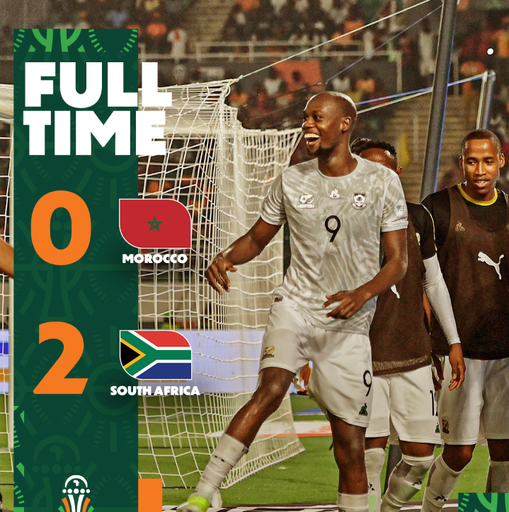Morocco the highest ranking FIFA side at the on going AFCON tournament in Cote d’Ivoire has been sent Packing by the Bafana Bafana of South Africa following a 2:0 loss in the hands of the South Africans.