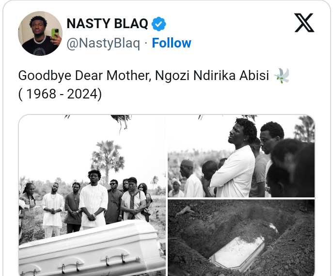 The emotional photos, including one of his mother’s white coffin, left many of Nasty Blaq’s fans in tears. Late Ngozi Abisi was born in 1968 and passed away in September 2024.