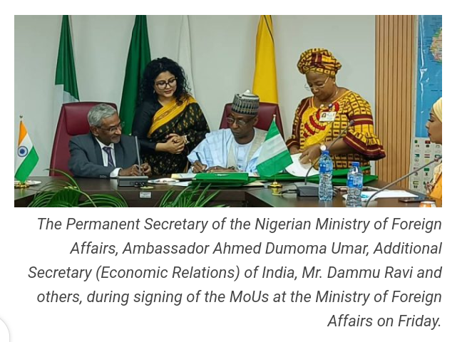 Ambassador Ahmed Dumoma Umar, Permanent Secretary of the Nigerian Ministry of Foreign Affairs, signed on behalf of Nigeria, while Mr Dammu Ravi, Additional Secretary (Economic Relations) of India, represented the Indian government. Speaking at the event, Ambassador Umar described the MoUs as significant milestones, highlighting their potential to foster growth, innovation, and sustainable development. He called on stakeholders from both countries to ensure the successful implementation of the agreements and hinted at more collaboration during the upcoming visit of Indian Prime Minister Narendra Modi.