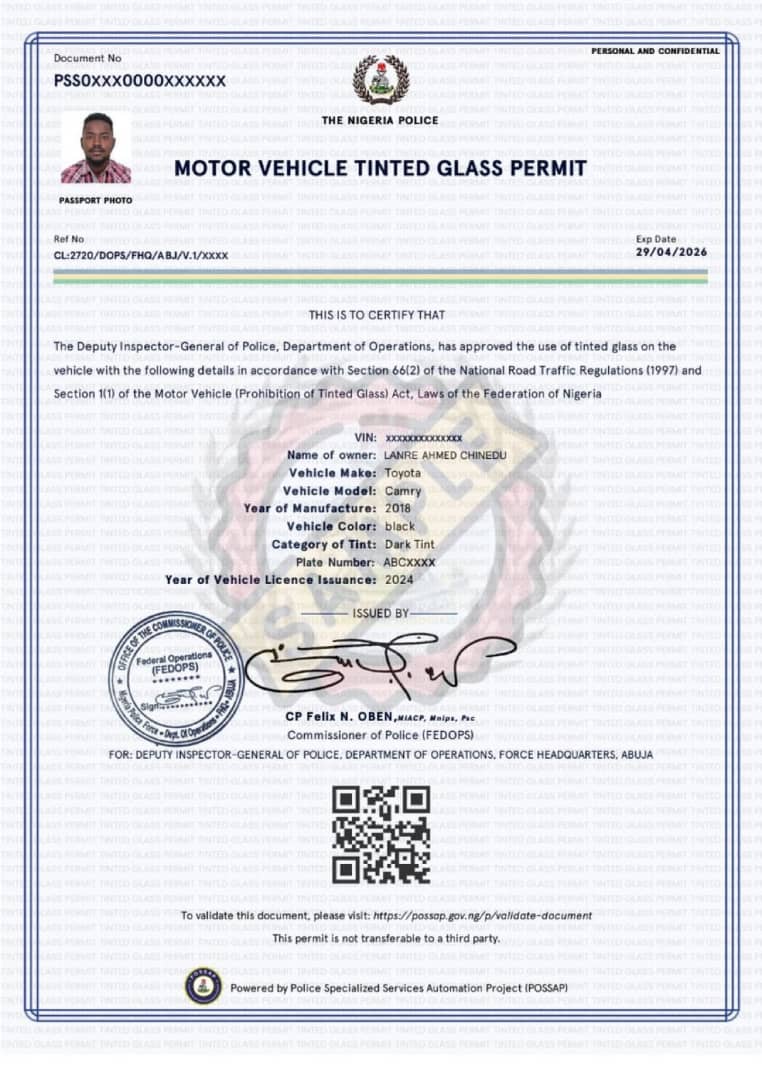 The application process is straightforward. Vehicle owners must register on the NPF’s tinted permit portal, provide proof of ownership, driver’s licence, and car insurance details, and submit to biometric verification at a state police command. Once approved, the permit is downloadable as a PDF, which must be carried in the vehicle at all times to avoid penalties, including fines of up to N50,000 or six months’ imprisonment. The NPF has also clarified that permits are non-transferable and require renewal annually, with certain government officials and security agencies potentially exempt.