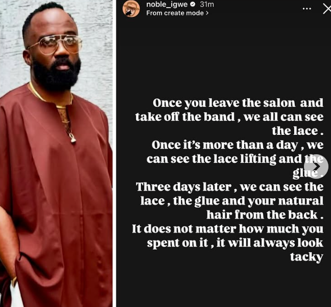 Igwe took to social media to express his thoughts, stating, “Once you leave the salon and take off the band, we all can see the lace… Three days later, we can see the lace, the glue, and your natural hair from the back. It does not matter how much you spent on it, it will always look tacky.”
