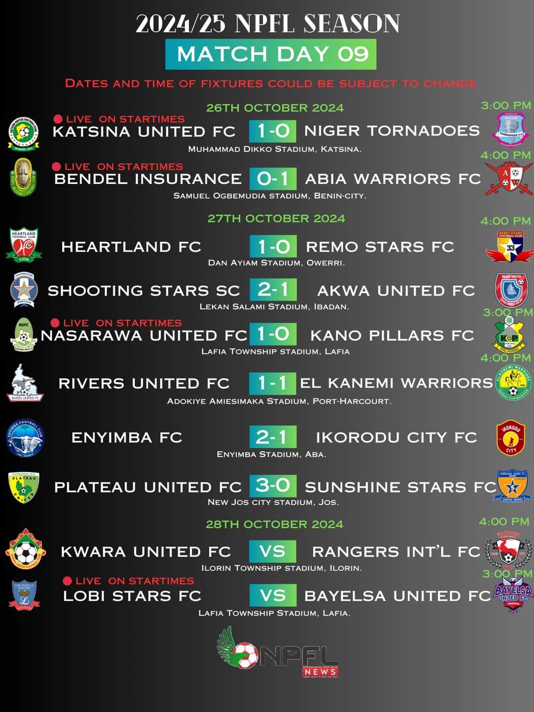 This exciting Matchday 9 action highlights the competitive nature of the NPFL, with teams battling fiercely both home and away as the season unfolds.