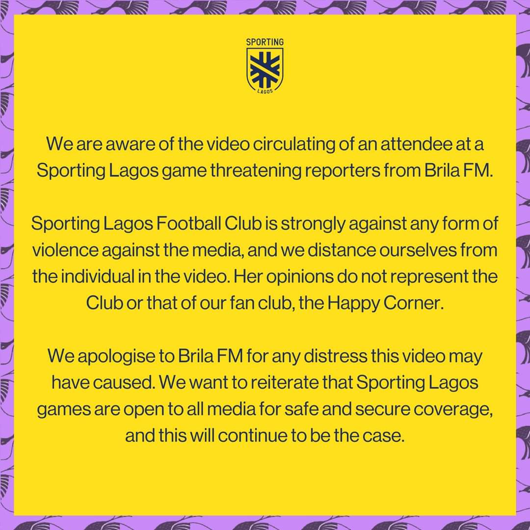 Sporting Lagos has responded to a video circulating online, where an alleged fan threatened a Brilla FM reporter, says the individual doesn’t represent their values and affirming that the door is always open to Brilla FM for Matchday coverage.
