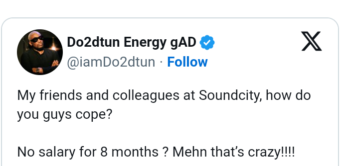 Nigerian on-air personality, Do2dtun, has taken to social media to express his outrage over a popular radio station’s failure to pay its staff for eight