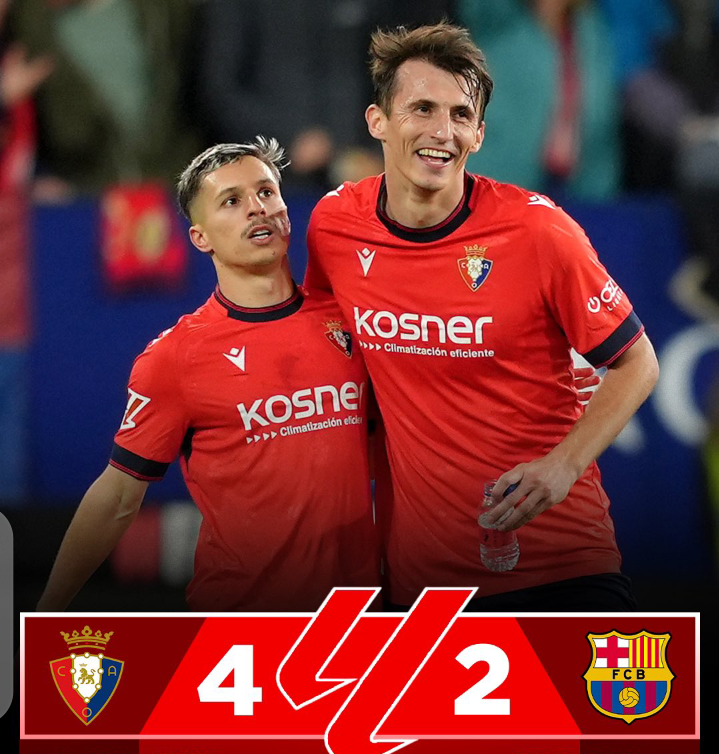 Barcelona’s unbeaten start to the La Liga season came to a shocking end as Osasuna handed them a 4-2 defeat, with Croatian striker Ante Budimir scoring twice to lead the charge at El Sadar.