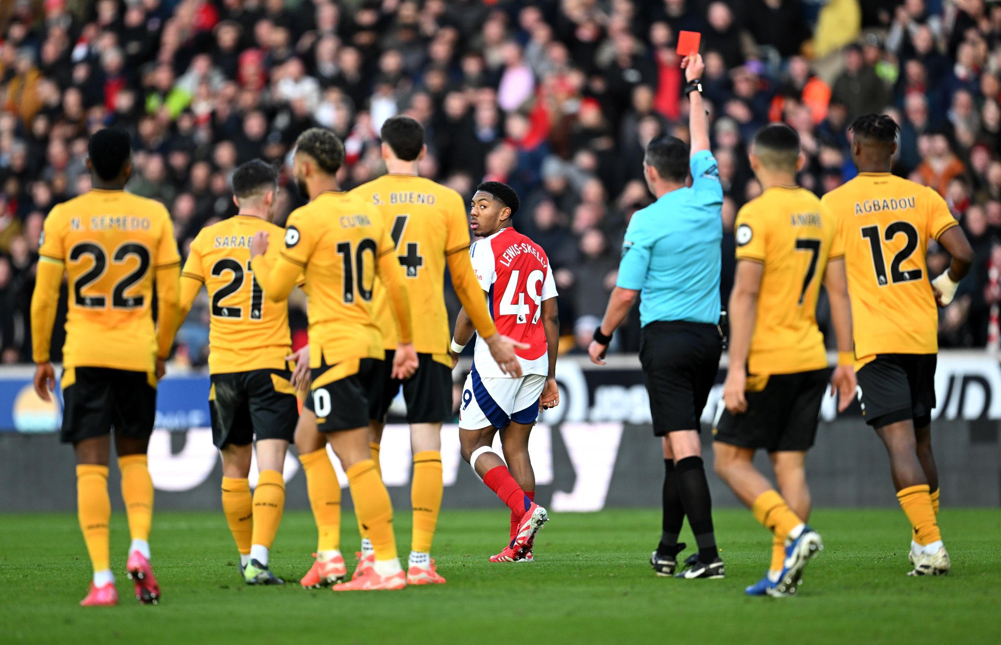 Lewis-Skelly was shown a straight red card by referee Michael Oliver after a challenge on Wolves’ Matt Doherty, 70 yards from Arsenal’s goal, as he attempted to break up a counter-attack. The decision, upheld by VAR, has been widely criticised as one of the most contentious moments of the season.