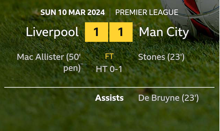 However, Liverpool equalized shortly after halftime when Darwin Nunez was fouled in the box by Ederson, resulting in a penalty converted by Alex Mac Allister.