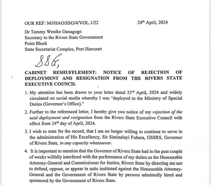 In his resignation letter addressed to the SSG and dated April 24, 2024, Adangor expressed his rejection of the redeployment and cited reasons for his departure. He accused Governor Fubara of unwarranted interference in the discharge of his duties, highlighting directives to abstain from handling legal matters against the state government.