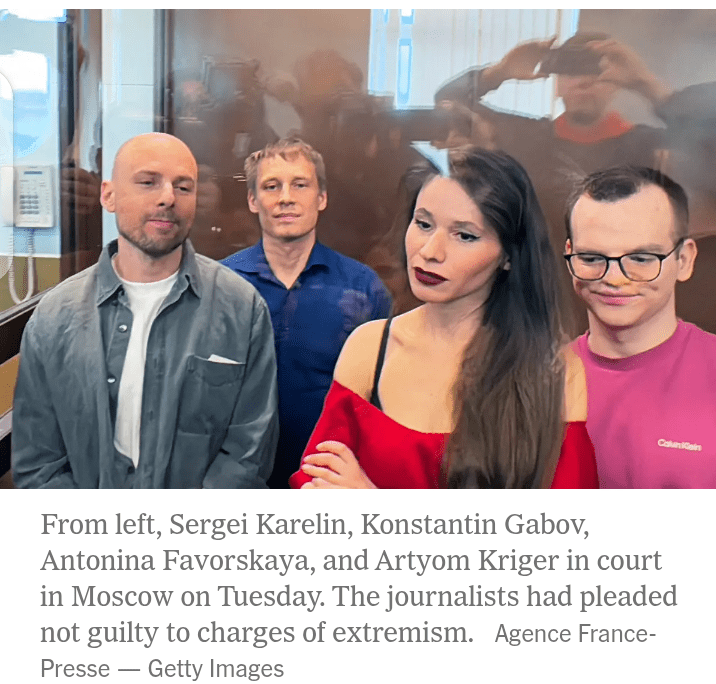The journalists — Antonina Favorskaya, Konstantin Gabov, Sergei Karelin and Artyom Kriger — were convicted on Tuesday for their alleged association with the Anti-Corruption Fund, an organisation founded in 2011 by the late opposition leader, Aleksei Navalny. The group was outlawed by the Kremlin and branded as extremist.