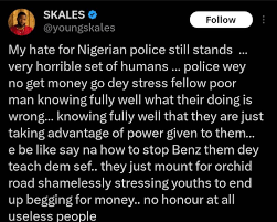 Skales wrote, “My hate for Nigerian police still stands…very horrible set of humans,” criticizing their exploitation of power and mistreatment of the public.