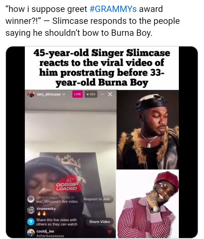 Slimcase stated that Burna Boy’s success and awards made him a big artiste in the music industry, and he felt it was necessary to show respect. He also mentioned that if younger artists like Rema, 24, win a Grammy, he would greet them with the same respect.