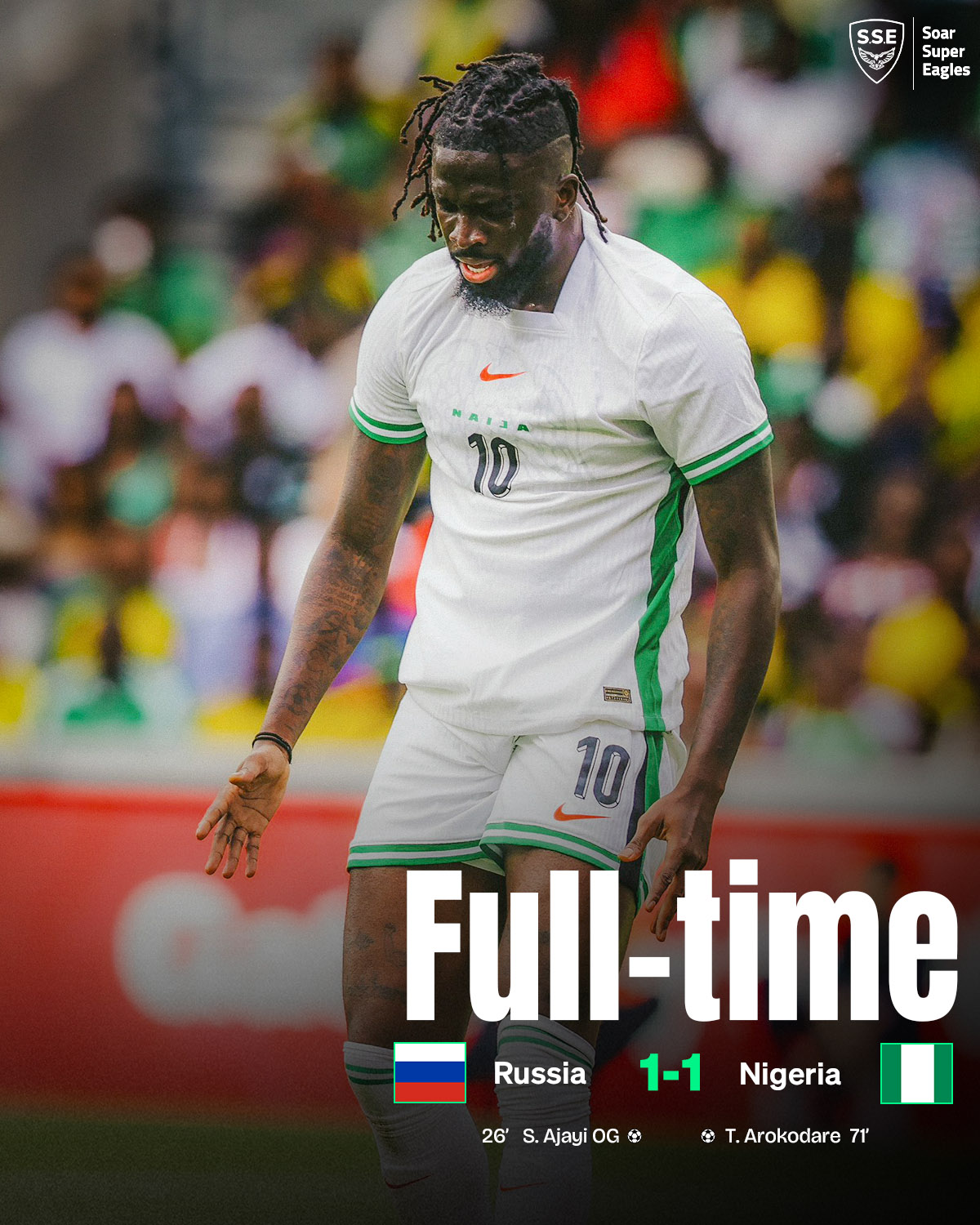 The game kicked off at 8:00 PM Nigeria time (WAT), with Russia, playing under the banner of the Football Union of Russia due to ongoing FIFA and UEFA sanctions, taking the lead in the 27th minute. A cross from Zenit St. Petersburg defender Danil Krugovoy was inadvertently turned into his own net by Nigeria’s center-back Semi Ajayi, giving the hosts an early advantage. The Super Eagles, however, showed resilience, equalizing in the 71st minute through a maiden international goal by Genk forward Tolu Arokodare. The 24-year-old capitalized on a rare error by Russia’s goalkeeper Matvey Safonov, whose poor clearance left Arokodare with a simple finish to level the score.