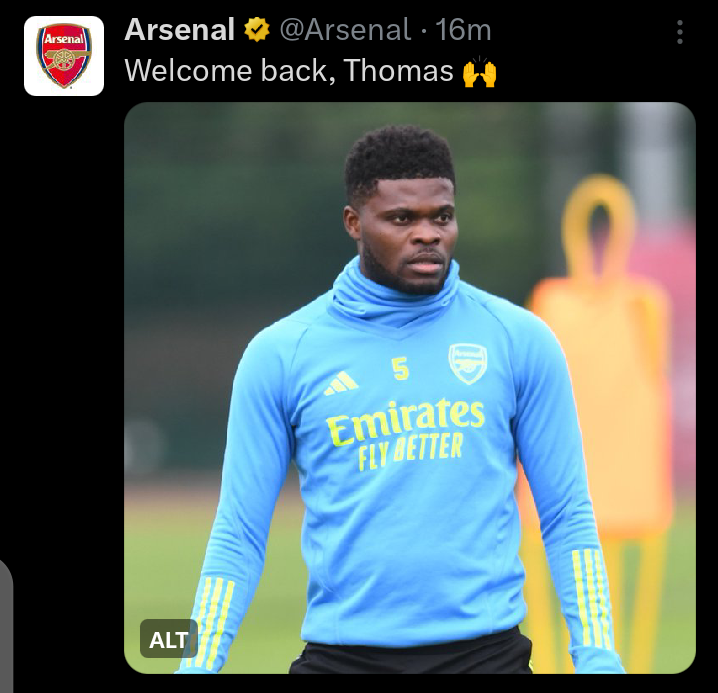Thomas Partey now back in full first-team training and he’s expected to be fit for the game against Nottingham Forest next Tuesday.