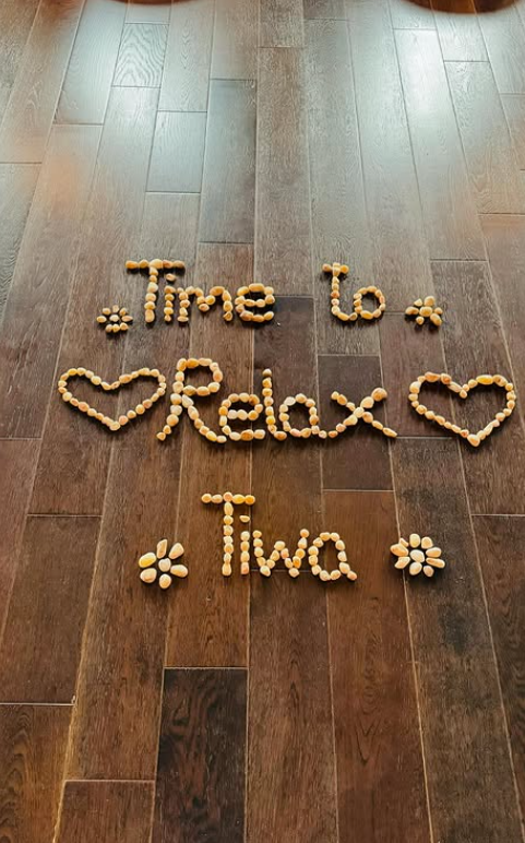 One photo showed her playfully arranging pebbles to spell out “Tiwa time to relax,” complete with a heart symbol, capturing the fun and laid-back vibe of the moment.