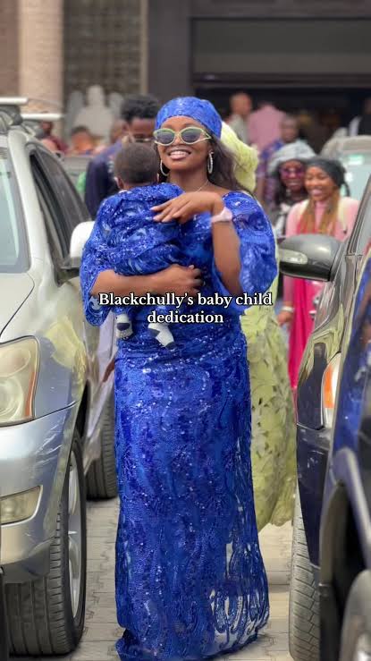 Not stopping there, the content creator also took her baby to church to dedicate him to God. Blackchully let go of her usual masculine outfits and rocked a blue lace blouse and wrapper attire with a matching headscarf. Her newborn son also had a tiny outfit sewn for him from the same material.
