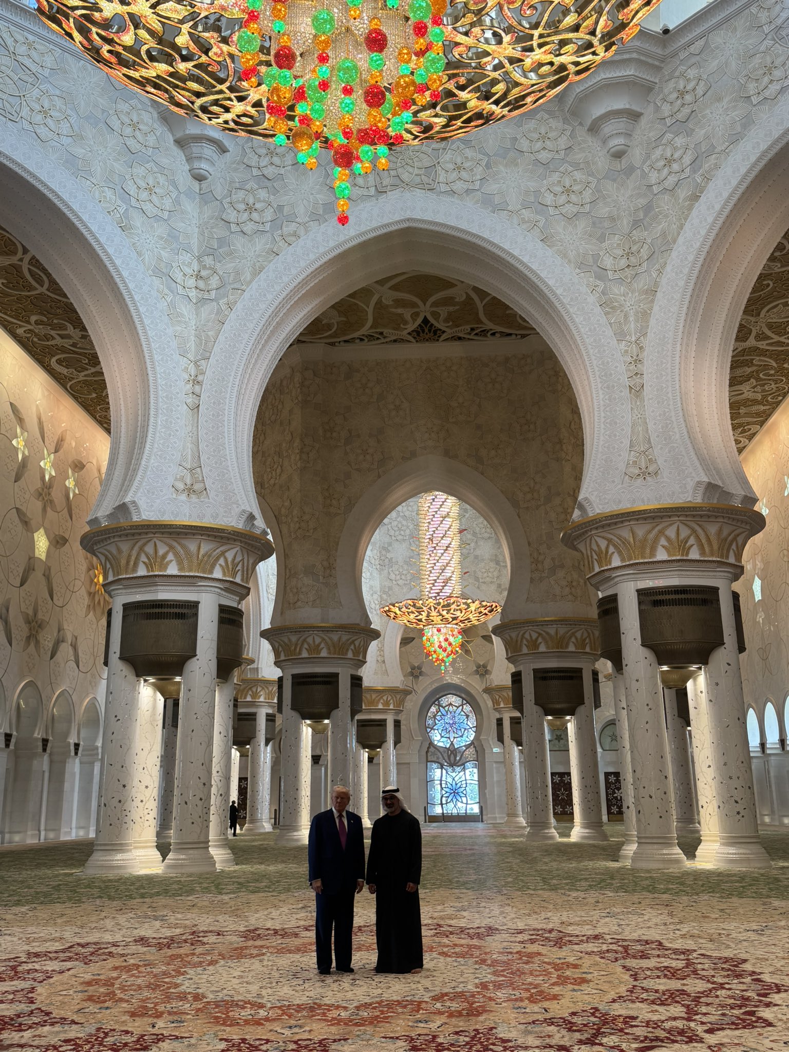 Upon arriving at Abu Dhabi International Airport on Thursday, President Trump was greeted with a ceremonial reception by UAE President His Highness Sheikh Mohamed bin Zayed Al Nahyan. The two leaders, joined by Defense Secretary Pete Hegseth and Trump’s special envoy to the Middle East, Steve Witkoff, shared a private meeting before heading to the iconic Sheikh Zayed Grand Mosque. Trump’s tour of the architectural marvel, a symbol of Islamic unity and cultural inclusiveness, was a highlight of the visit. Accompanied by mosque director Yousif Al Obaidli, the president admired the structure’s 82 domes and intricate calligraphy, later praising its “unbelievable beauty” in remarks to the press.