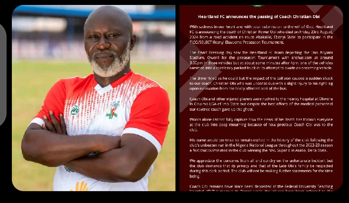Heartland FC has been plunged into mourning following the tragic death of their head coach, Christian Obi. The Nigeria National League (NNL) side confirmed that Obi lost his life in a ghastly road accident on Friday, as reported by Govima Sport.