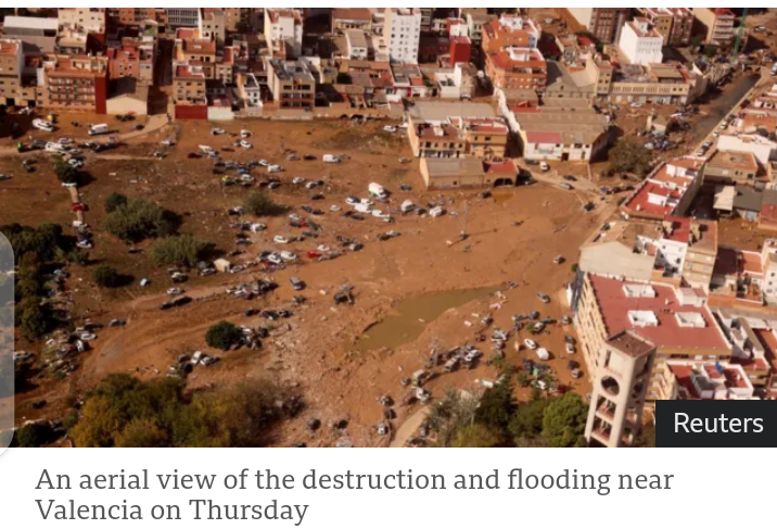 A three-day national mourning period has been declared, with flags at half-mast and moments of silence observed across the country. Growing public anger has spurred questions over the timeliness of warnings issued by Spain’s civil protection agency, which reportedly only sent alerts hours after initial flooding had started. Officials have described the flooding as “unprecedented,” linking it to climate change and a natural weather phenomenon called “gota fría,” which brings cold air over warmer Mediterranean waters, intensifying rainfall.