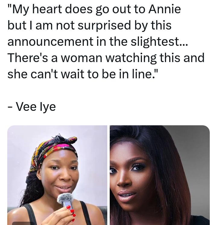In a tweet, Vee noted that amidst the controversy, another woman is likely plotting to take Annie’s place in 2Baba’s life. “At the end of the day, there’s a woman out there watching all of this unfold, plotting how she can be next in line. To God be the glory,” she wrote.